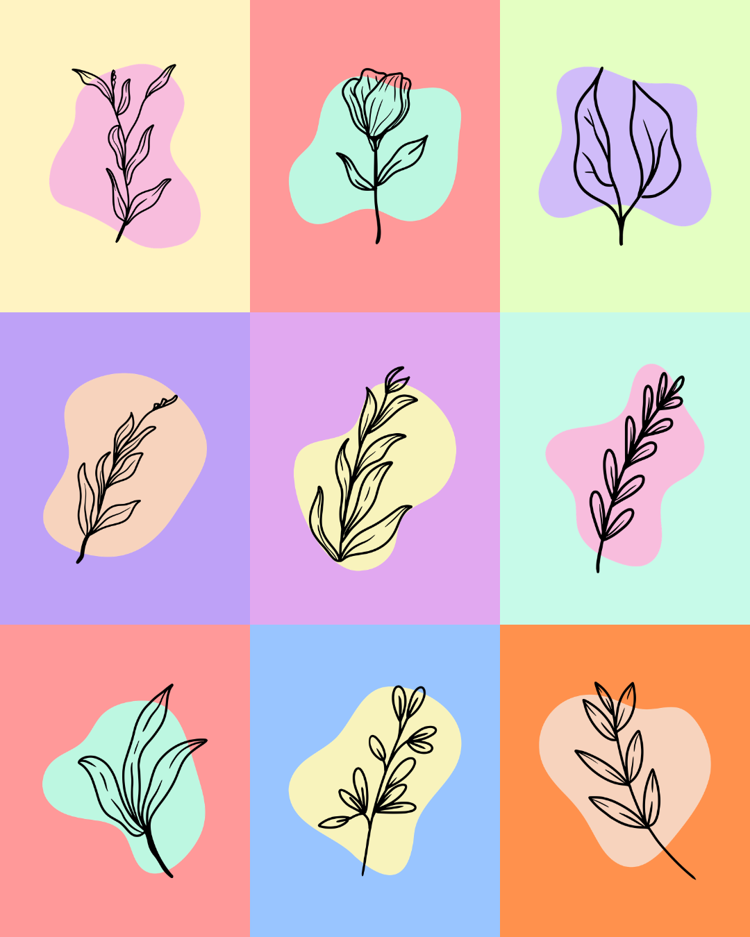 Floral Line Illustration Set. A soft and modern collection of floral line illustrations, blending simple hand-drawn forms with gentle abstract color shapes.