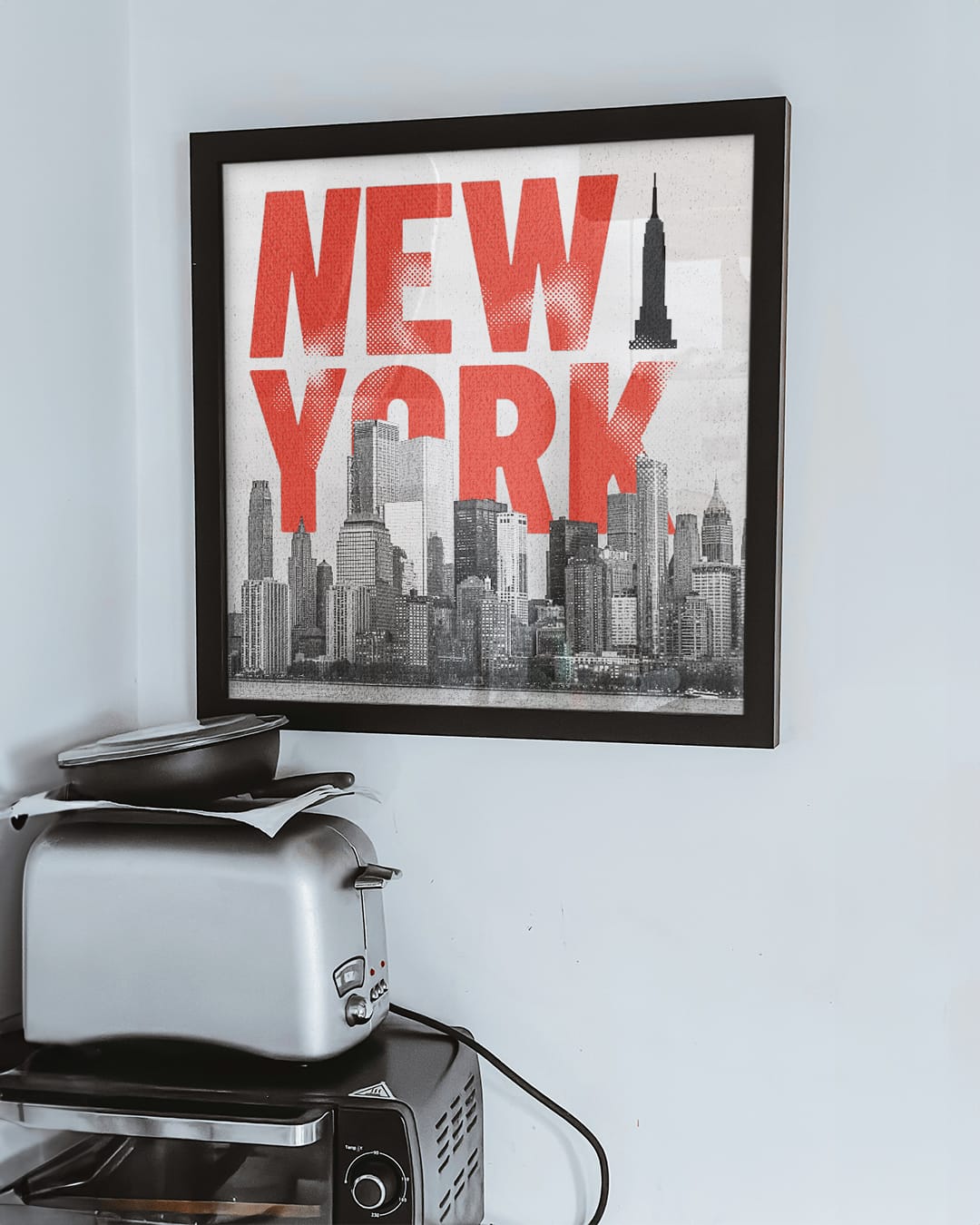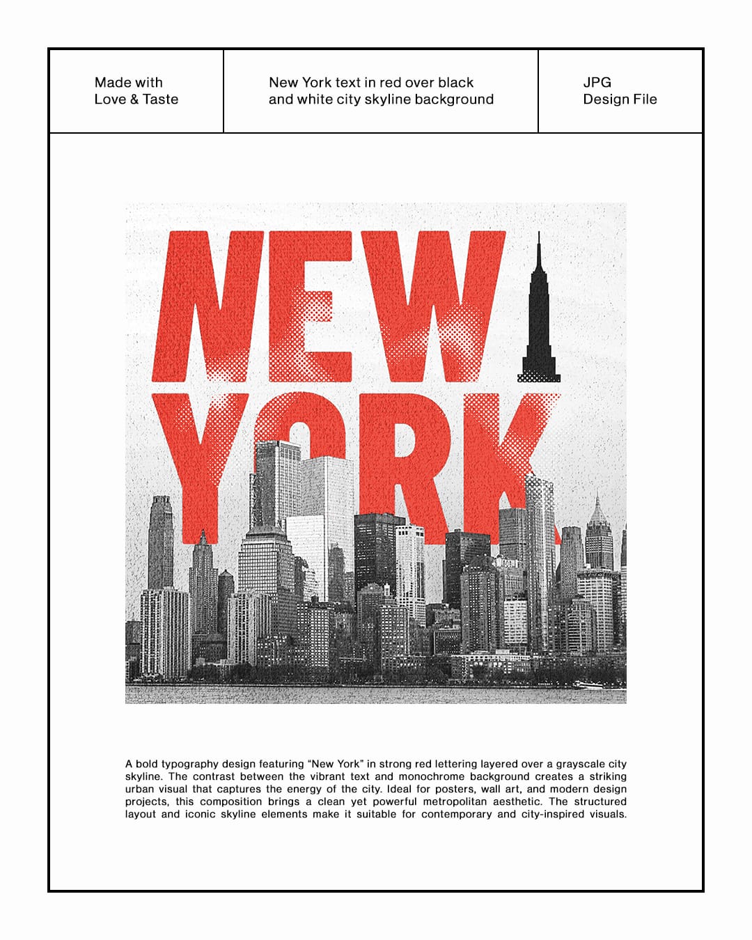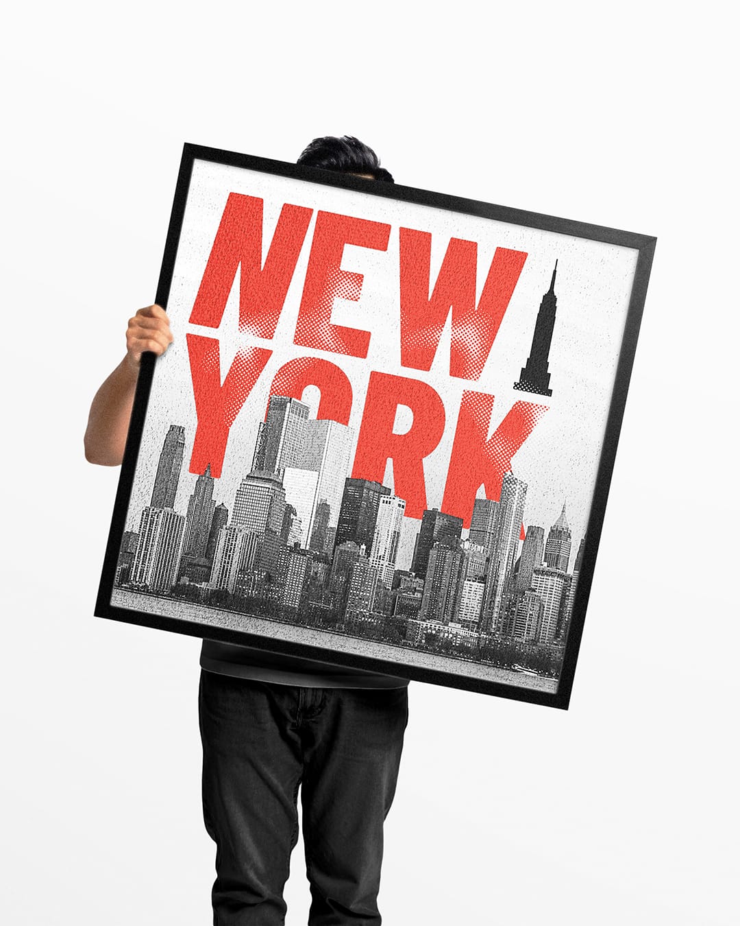 New York. Bold and urban, this poster combines oversized typography with a city skyline in a high-contrast layout. The layered composition creates a dynamic, modern look. Perfect for studios or contemporary interiors, it brings a strong and energetic vibe.