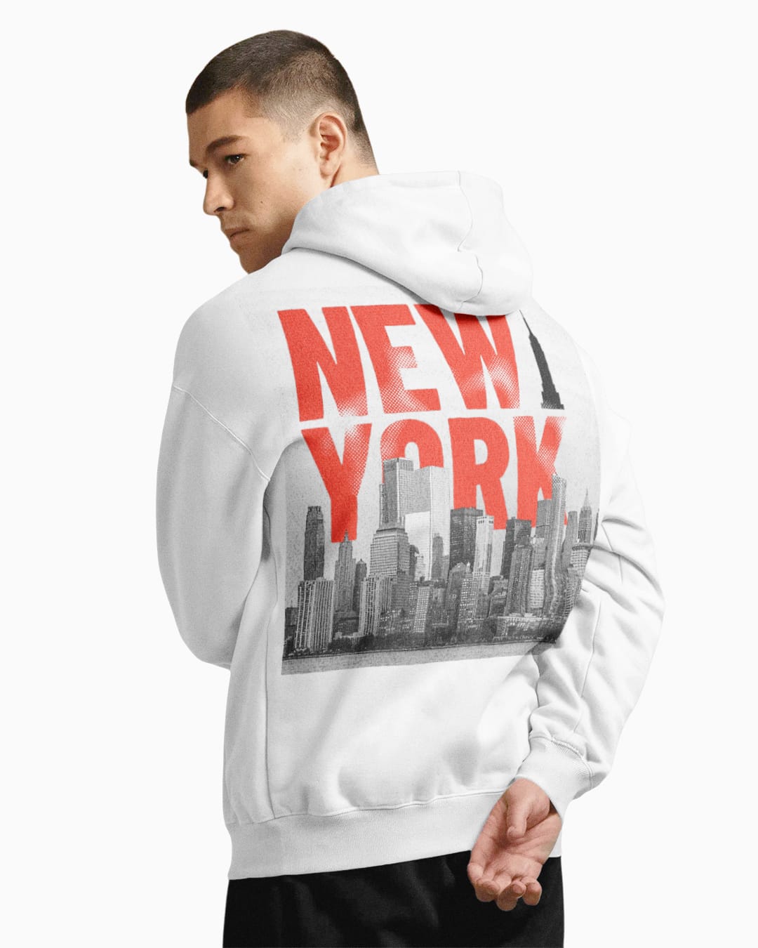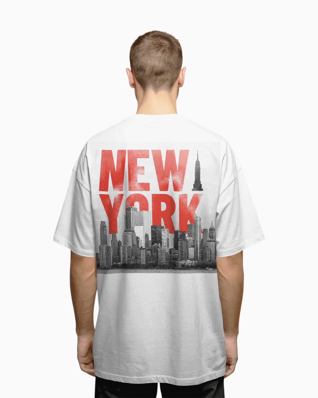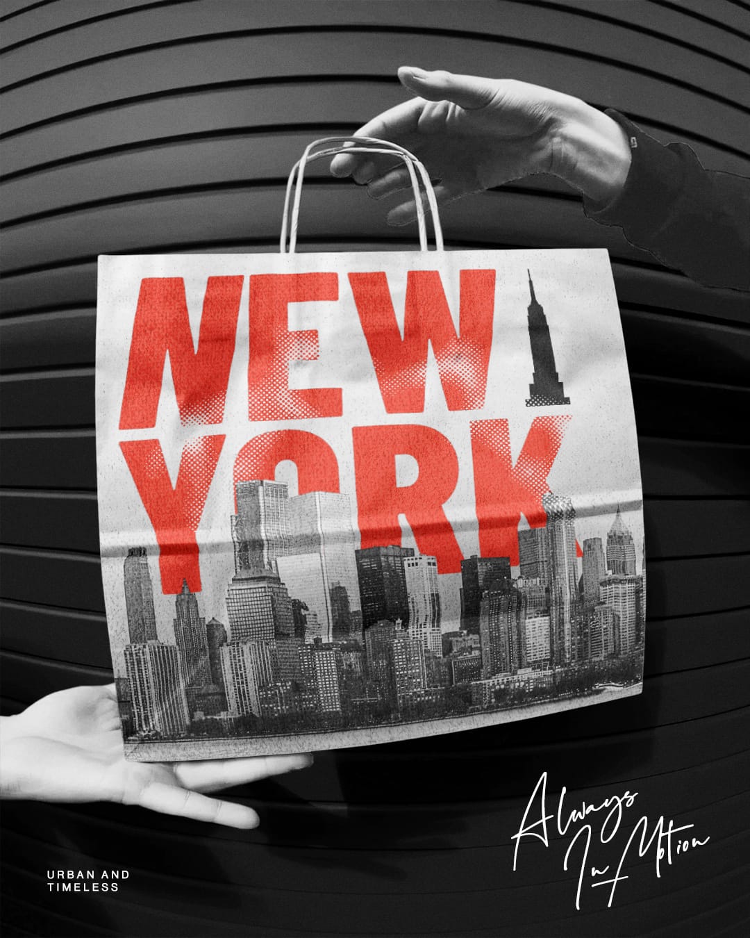 New York. Bold and urban, this poster combines oversized typography with a city skyline in a high-contrast layout. The layered composition creates a dynamic, modern look. Perfect for studios or contemporary interiors, it brings a strong and energetic vibe.