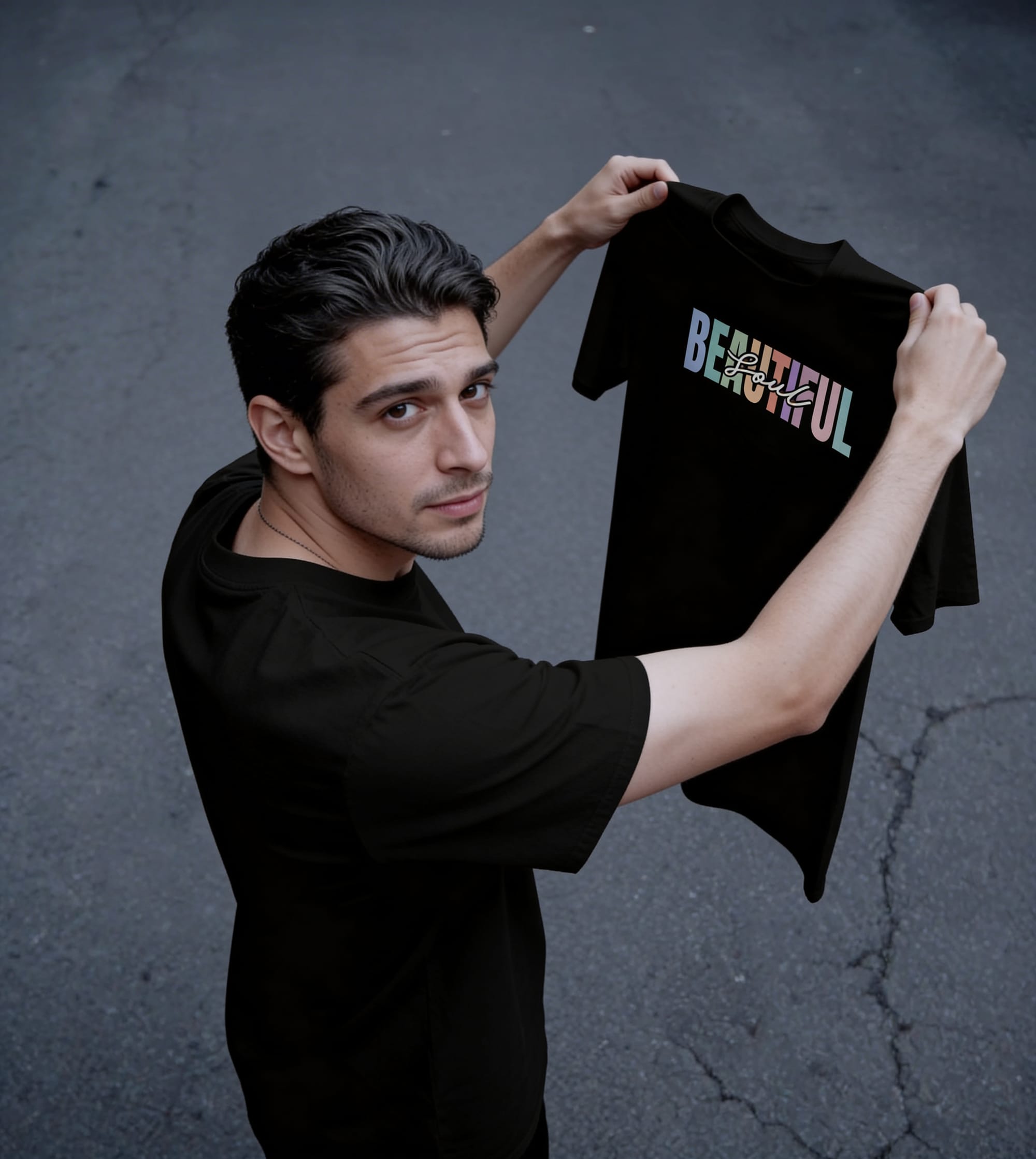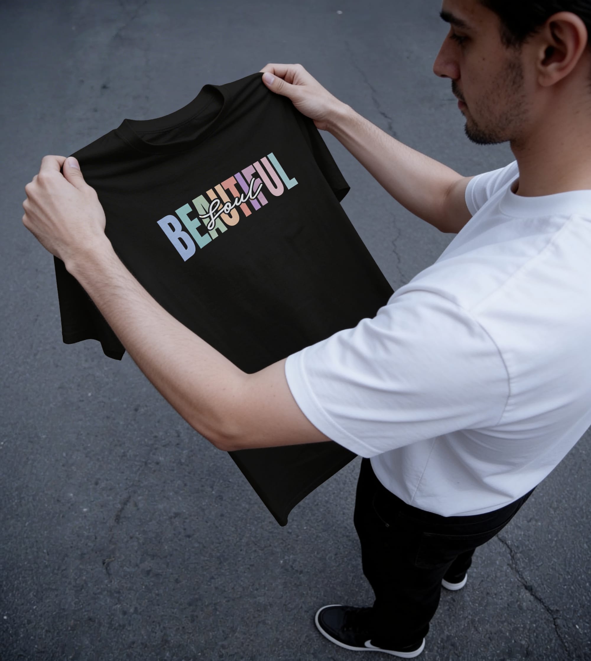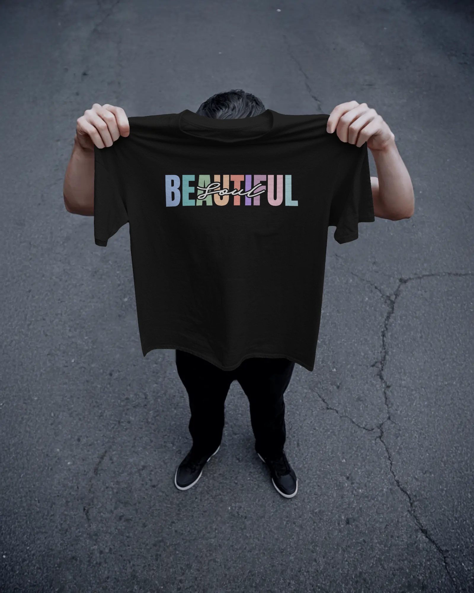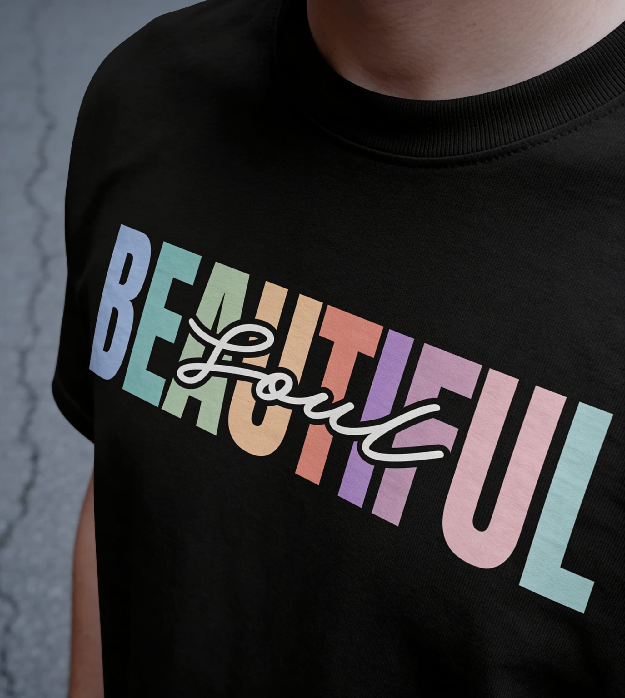 Beautiful Soul. A vibrant and uplifting typography design featuring the word "BEAUTIFUL" in bold, sans-serif block letters, each a different pastel color. Layered over the center is the word "Soul" in an elegant, white script font with a thin black outline. The combination of rigid geometry and fluid calligraphy creates a balanced, modern aesthetic against a solid black background.