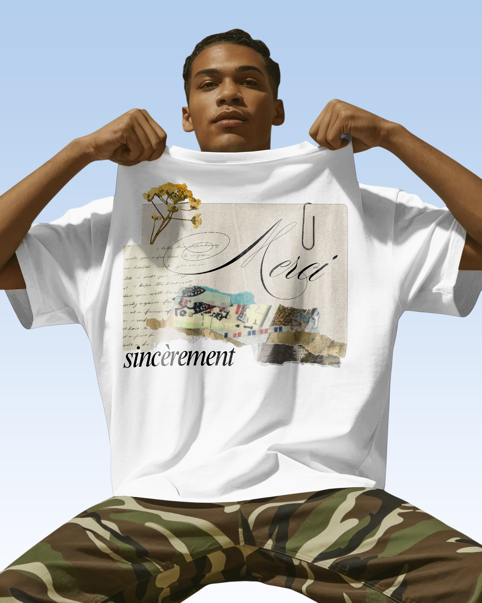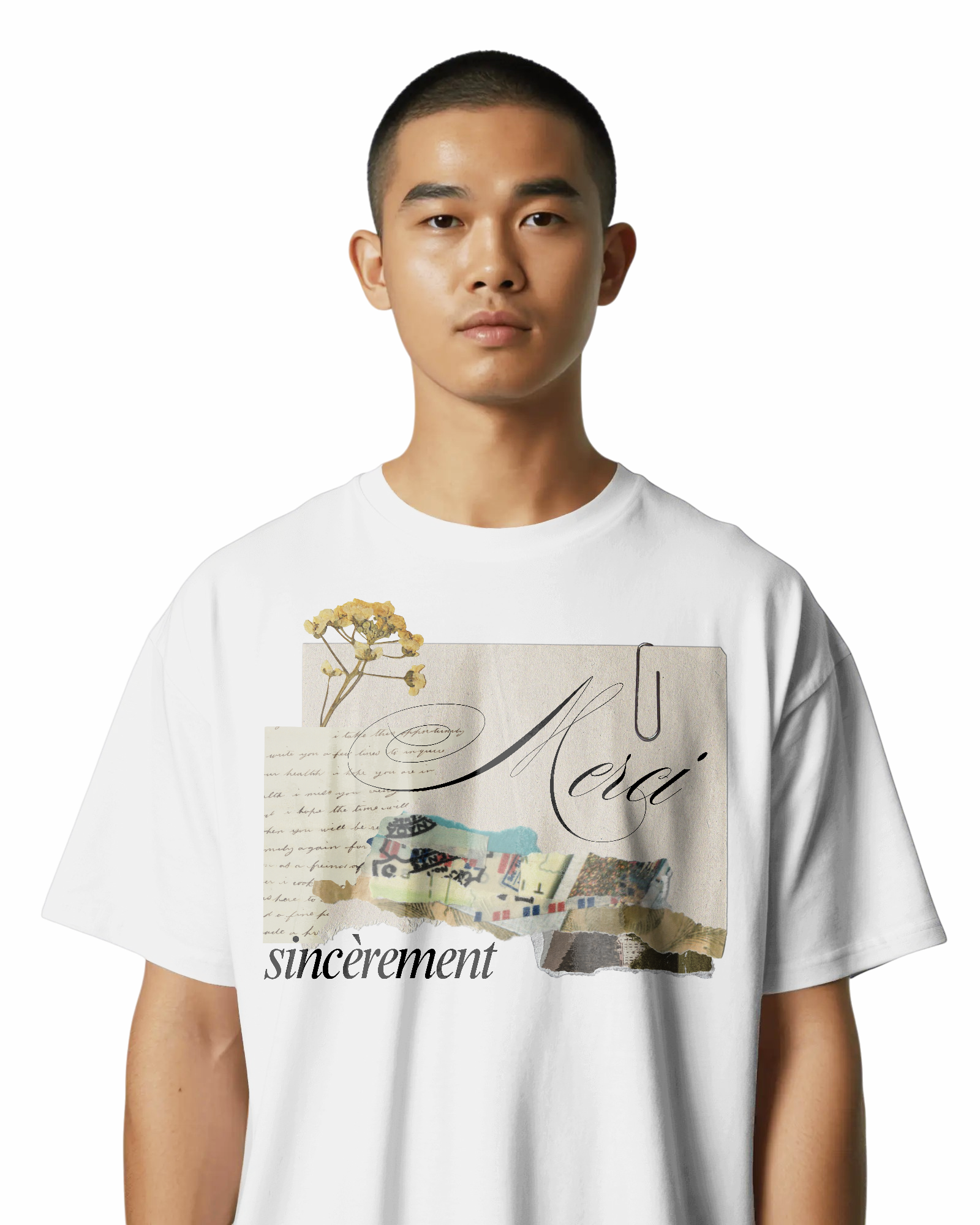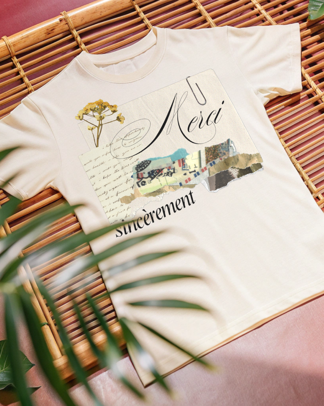 Vintage French Scrapbook Collage Design with Elegant "Merci Sincèrement" Calligraphy, Antique Paper Textures, Dried Yellow Wildflowers, and Retro Ephemera Paperclip Aesthetic